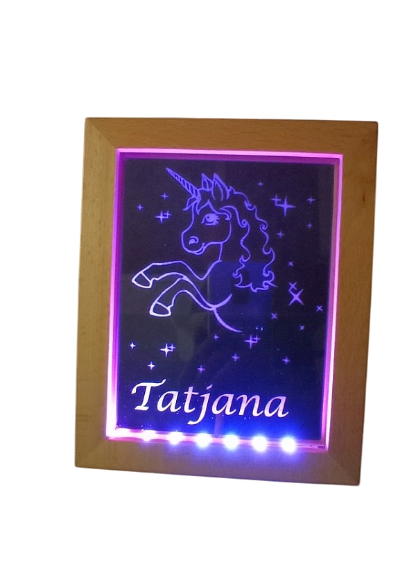 Lesena otroška nočna lučka z imenom in motivom samoroga