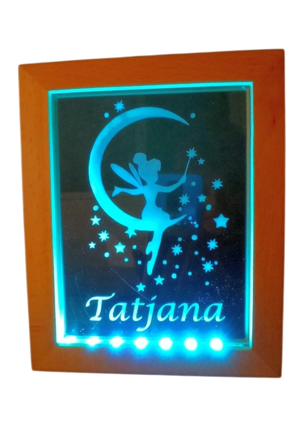 Lesena otroška nočna lučka z imenom in motivom čarobna vila na luni